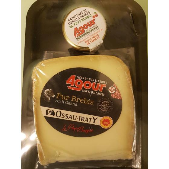 Ingrédients: lait pasteurisé de brebis, eau, sel, présure cerises noires 65%, eau, sucre, pectines de fruits