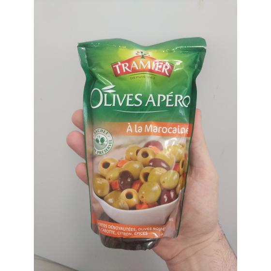Ingrédients: Olives vertes dénoyautées, olives noires ou naturel entières, sel, carotte (4%), huile d'olive vierge extra, (2%), épices (2,5%), correcteur d'acidité : acide citrique, antioxydant : acide ascorbique.