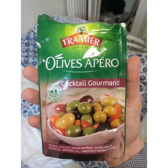 Ingrédients: Olives vertes entières, olives noires au naturel entières, préparation légumes 5% (ail, poivron, carotte), sel, huile d'olive vierge extra, correcteur d'acidité : acide citrique, antioxydant : acide ascorbique.