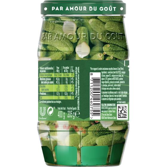 Ingrédients: Cornichons 53,7%, eau, sucre, vinaigre d'alcool, sel, graines de moutarde, oignon, aneth, poivron rouge, arômes naturels d'aneth et de plantes aromatiques, affermissant : chlorure de calcium.