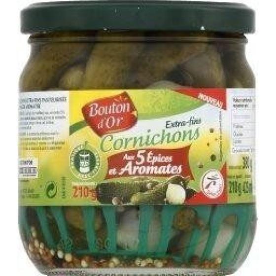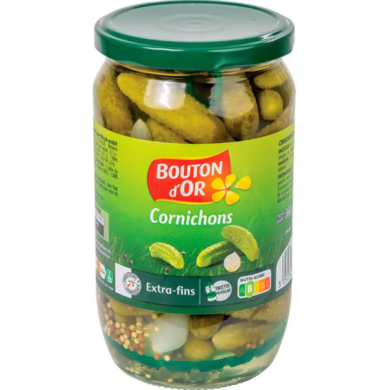 Ingrédients: Cornichons (sulfites), eau, aromates 5% (oignons, graines de moutarde jaune et noire, graines de coriandre, poivre, piment de Jamaïque), vinaigre d'alcool, sel, arômes, affermissant : chlorure de calcium.Bouton d'Or à votre écoute au 0 800 008 180 (appel gratuit depuis un poste fixe).
