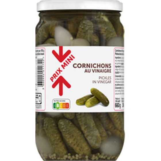 Ingrédients: Cornichons*, eau, vinaigre d'alcool, petits oignons*, sel, estragon, graines de moutarde, coriandre, arôme.*Contient des sulfites