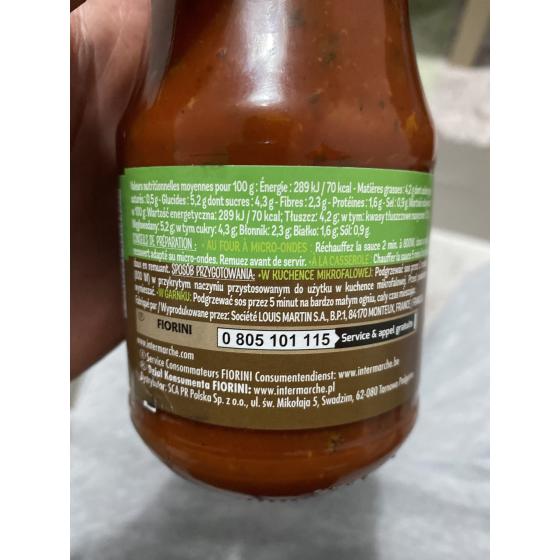 Ingrédients: SAUCE BOLOGNAISE A LA VIANDE DE BOEUF NGREDIENTS: Purée de tomates 45%, pulpe de tomates 20% ronde bovine price equivalent viande crue 20%), oignons 5%, carottes 4%, huile tournesol su man transformé de pomme de terre, ail, acidifiant : acide lactique, are nature (do files, poivre, thym 0,02%. Traces éventuelles de lait, moutarde INFORMATIONS: ommer de préférence FIORINI N°Vert 0800 008 180 IN POSTE FIXE