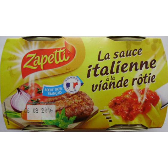 Ingrédients: Pulpe de tomates et concentré de tomates 56%, viande 17,5% (porc, boeuf), eau, légumes (carottes 6%, oignons 3%), sucre, sel, amidon transformé de maïs, persil 0,3%, huile de tournesol, arômes, ail.