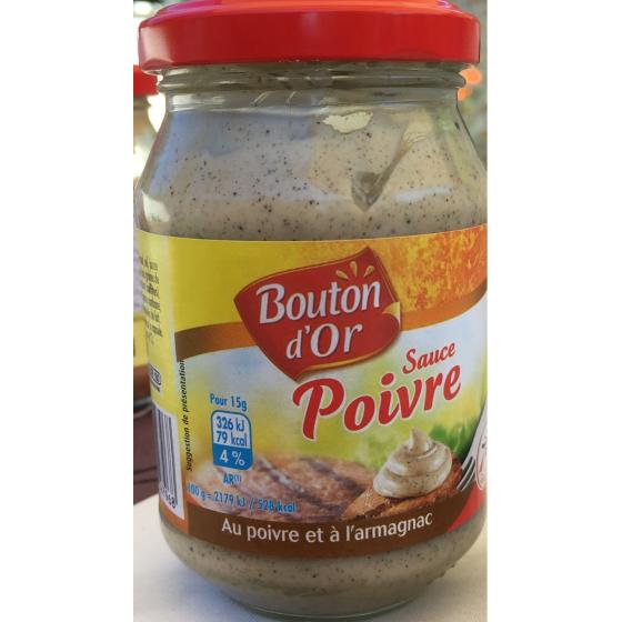 Ingrédients: Huile de colza, eau, vinaigre d'alcool, sucre, sel, jaune d’_œuf_, poivre noir de Madagascar 2%, amidon modifié de maïs, moutarde de Dijon (eau, graines de _moutarde_, vinaigre d'alcool, sel), épaississant : gomme xanthane, arôme, Armagnac, colorant : caramel (E150c).