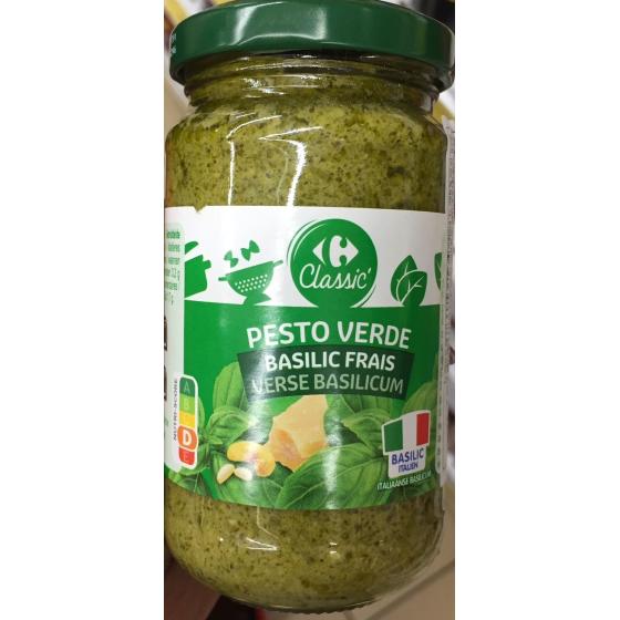 Ingrédients: Basilic (26,8 %), huile de tournesol, pomme de terre, huile d'olive vierge extra (8,4 %), eau, Grana Padano (dont œuf) (4,1 %), Pecorino (4,1 %), noix de cajou, sel, pignon de pin (1 %), ail (1 %), acide lactique, poivre, huile essentielle de basilic.