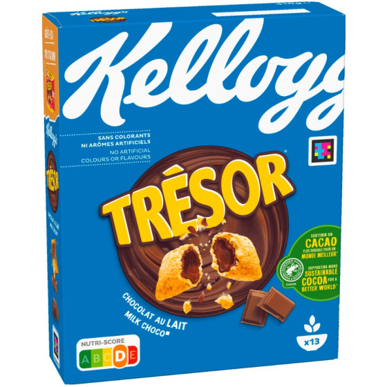 Ingrédients: Farine de BLÉ complet 31,4 %, semoule de maïs, sucre, dextrose, huile de palme, farine de BLÉ, poudre de cacao* 5,4 %, sirop de glucose, amidon de BLÉ, LAIT écrémé en poudre, huile de tournesol, carbonate de calcium, extrait de malt d'ORGE, cacao maigre en poudre*, arômes naturels, beurre de cacao*, sel, pâte de cacao*, émulsifiant : lécithines, LACTOSÉRUM en poudre (LAIT), matières grasses de LAIT, antioxydant: extrait riche en tocophérols, fer, vitamines B3, B5, B6, B2, B9. Peut contenir des FRUITS À COQUES. *Bilan massique certifié Rainforest Alliance. www.ra.org/fr.