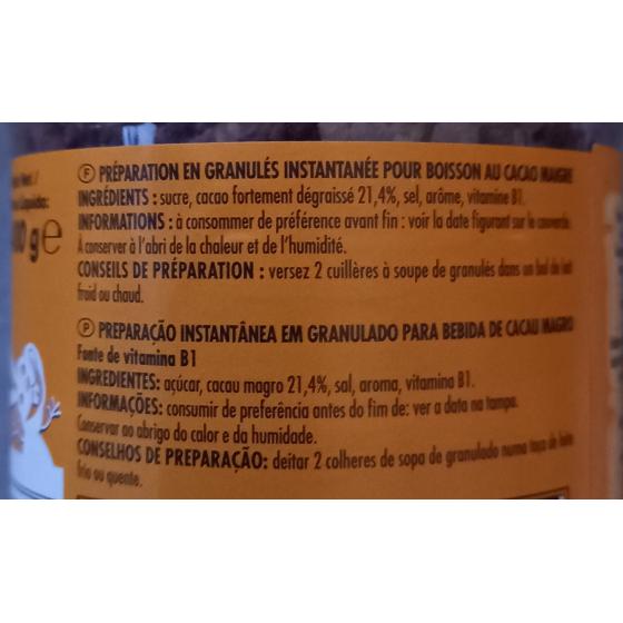 Ingrédients: Sucre, cacao maigre en poudre (18%), cacao en poudre (18%), emulsifiant (lécithines (tournesol)), antiagglomérant (E341), sel, arôme. Peut contenir: lait, soja.