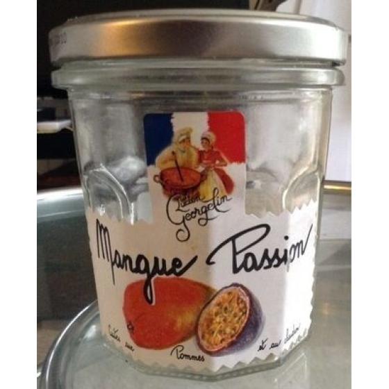 Ingrédients: Fruits exotiques 50g (mangues 36g, fruits de la passion 14g), sucre 50g, pommes 14g, gélifiant : pectines,