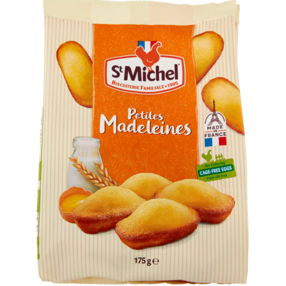 Ingrédients: Farine de blé tendre, sucre, beurre 26%, œufs, sel, poudres à lever: carbonates de sodium et acide citrique, arôme naturel de vanille, lait écrémé en poudre. Traces éventuelles de: fruits à coque, graines de sésame, soja.