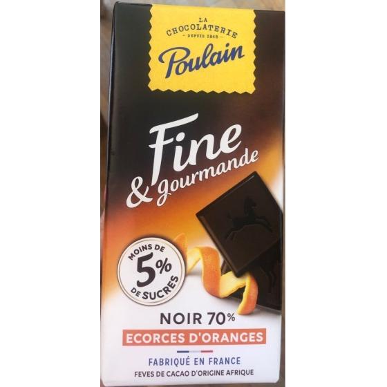 Ingrédients: Pâte de cacao, sucre, cacao maigre en poudre, écorces d'oranges confites 7% (écorces d'oranges 4.2%, sucre, dextrose, correcteur d'acidité : acide citrique), beurre de cacao, émulsifiant : lécithines, huile essentielle d'orange, arôme naturel de vanille. Peut contenir : céréales contenant du gluten, lait et fruits à coque. Cacao : 70% minimum dans le chocolat noir.