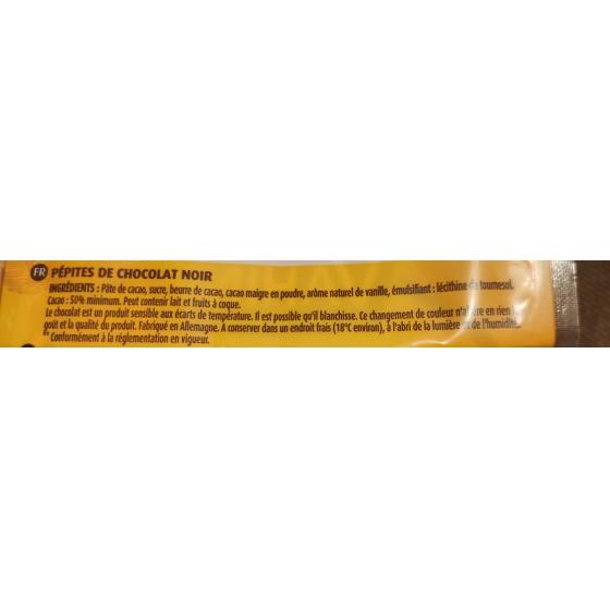 Ingrédients: Sucre, lait en poudre (16,6%), beurre de cacao, pâte de cacao, protéines de lait, émulsifiant : lécithine de soja, arôme naturel de vanille. Peut contenir des fruits à coque.