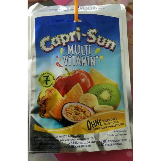 Ingredients: Eau, concentré de fruits (pomme, pêche, orange, raisin, poire, abricot), sucre, régulateur d'acidité : acide citrique, vitamines (A, C, E, B3, B5 et B9).